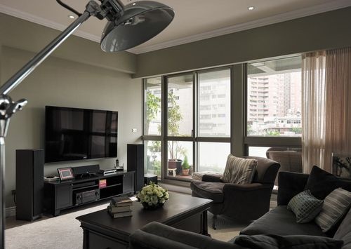 灰绿色的墙面与浅色地毯很好的平衡了深色家具的沉闷感。