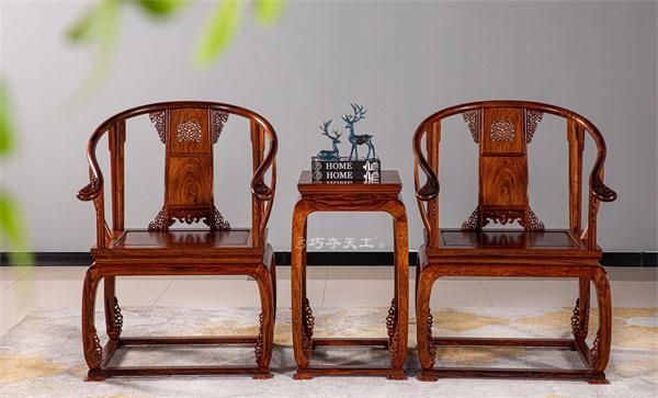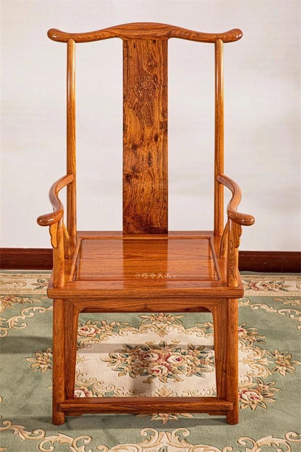 经典皇宫椅:整器的雕刻展现出高超的技艺。后背板上窄下宽,呈S形,为三截攒框设计,上截开光镂空立体雕卷草纹,中截平装,下截雕云纹朝下亮脚像倒挂的蝙蝠。扶手出头是卷草纹图案,三面透雕加浮雕,整挖过桥,全手工将中心掏空,采用最难的错层雕刻,彰显高贵。