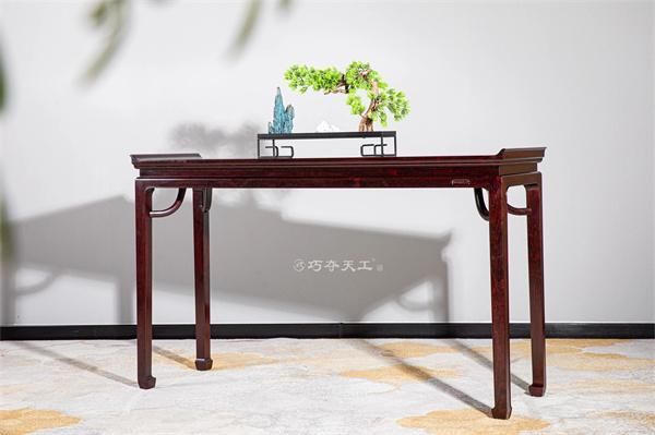 巧夺天工红木的霸王枨翘头案,四足上端以霸王枨顶入桌面下的穿带枨上,坚实牢固,冰盘沿向下收缩连接束腰。巧夺天工红木木材储备量丰富,涵盖多类国标红木,顾客钟爱的家具款式可择材质定制。
