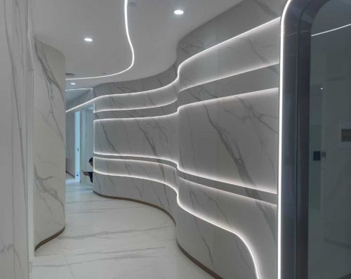 这种工艺不仅能保留岩板的物理性能,还能提升其韧性,适合用于家居装饰、建筑外墙等领域,优美弧度,无缝衔接。