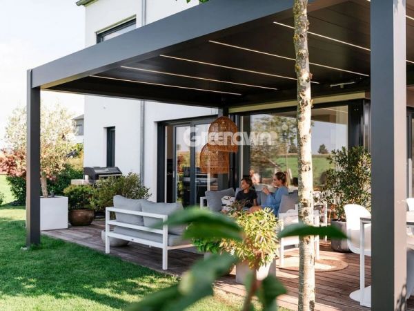 格绿朗-铝合金遮阳棚(维拉遮阳百叶篷)以“简约、雅致、自然”的美学理念,采用高强度的结构设计与铝合金材质,兼具出色的承重性能与抗风雪能力,最大单体跨度可达4.5米×7米,不仅可实现大面积遮阳挡雨,更提升了建筑外延空间的舒适性与整体美感。产品在功能上也实现多项突破。创新性的顶篷百叶片组装系统,使百叶开合更贴合、运行更安全、安装更便捷,用户可轻松调节光线。隐藏式排水系统与氛围照明设计,进一步强化了遮阳、防雨、调光与灯光氛围等多重功能。