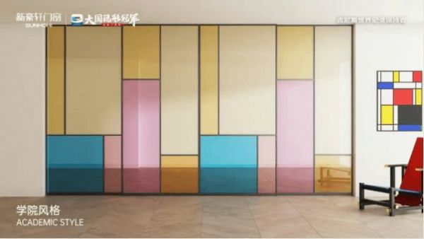 高定艺术门系列学院风格,设计灵感源于以荷兰艺术家皮埃德·蒙德里安(Piet Mondrian)为代表的风格派,通过垂直和平行线条组成最基本的艺术要素,叠加高饱和三原色,用秩序感消解生活的杂乱,用纯粹性治愈视觉的疲惫,让每一次推门都成为与艺术的温柔邂逅,为空间注入内敛的艺术张力。