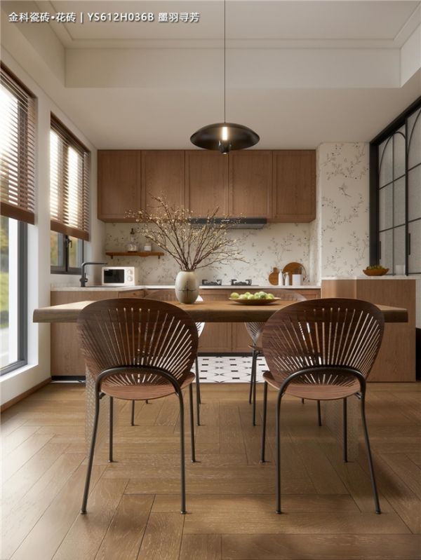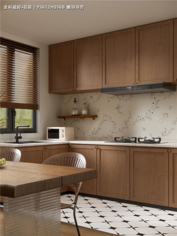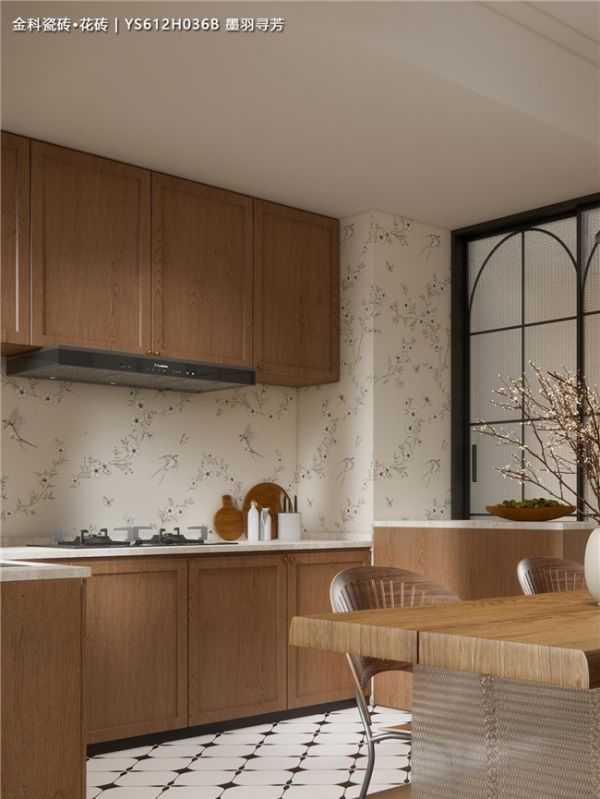 经典搭配:浅原木橱柜+花砖背景墙,温馨感瞬间拉满,怎么搭都不出错。