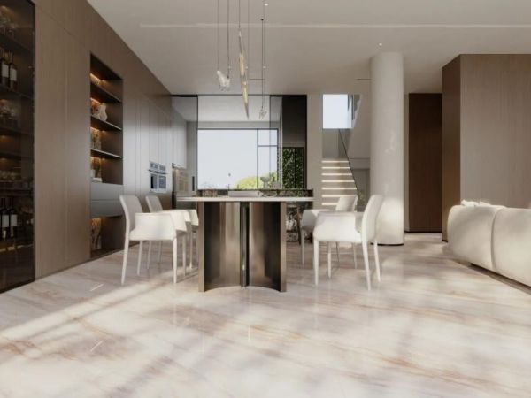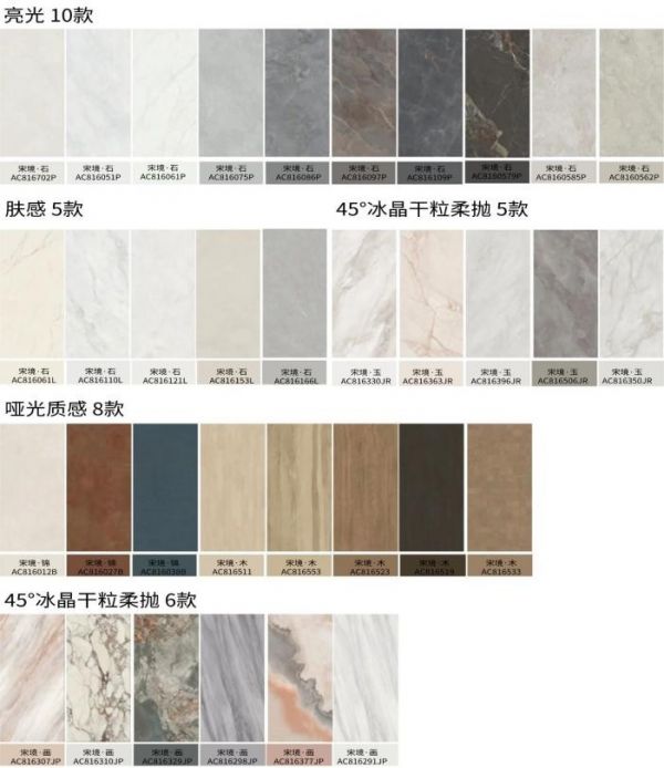 宋境·玉系列采用45°柔抛叠加冰晶干粒工艺,呈现温润玉石光感;宋境·石系列通过新一代高透釉和第四代肌肤釉技术,还原天然石材的通透肌理;宋境·锦系列运用3D立体精雕结合闪光干粒,雕琢锦缎暗纹;宋境·画系列则采用高透釉与冰晶干粒,渲染水墨朦胧意境;宋境·木系列采用仿古精雕工艺,精准复刻木材原生质感。
