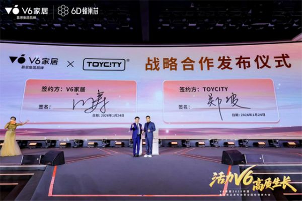 大会现场,V6家居与潮流玩具品牌ToyCity举行了合作仪式。ToyCity创始人兼总经理郑波表示:“V6家居与ToyCity同样专注于年轻消费群体,都致力于为消费者创造更美好的生活体验。这次合作是一次‘潮玩基因’与‘家居科技’的深度融合。”通过IP联名、场景化营销等方式,V6家居成功将品牌边界从家居场景拓展至潮玩、文化、社交等多元化领域,增强了品牌的趣味性与社交传播力。