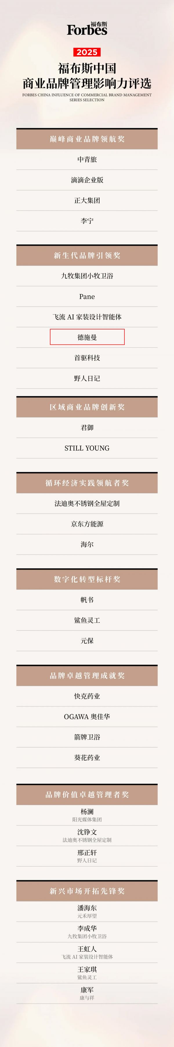 德施曼荣膺福布斯中国「新生代品牌引领奖」
