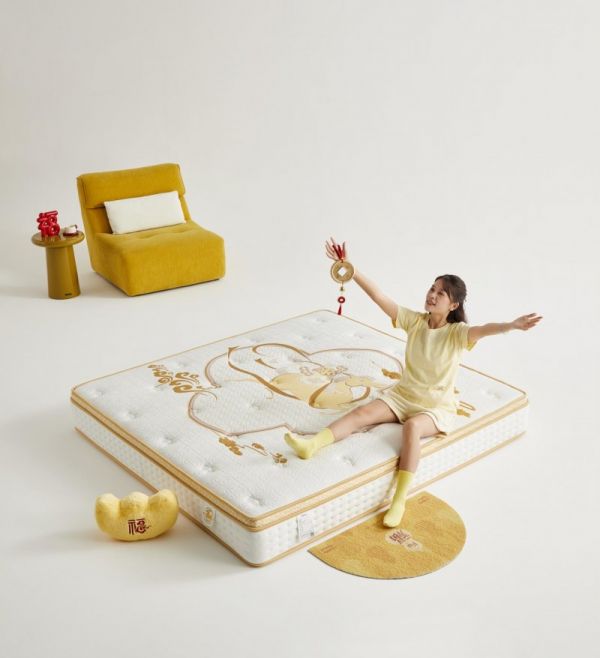 在外观上,新品床垫将文化祝福与舒适体验巧妙结合。床垫表面以海棠花窗为外框设计,内嵌奔跑瑞马元素,寓意“金马踏云,纳福招财”。搭配葫芦纹、祥云等传统吉祥纹样,传递出福禄安康的美好寓意。睡在这张床垫上,让日子柔软温馨,财运源源而来。
