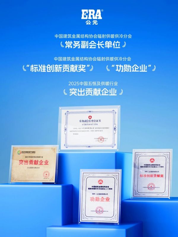 这份硬实力,也赢得了行业的高度认可。在2025中国五恒产业峰会暨中国建筑金属结构协会辐射供暖供冷分会20周年大会上,公元股份一举斩获“功勋企业”“标准创新贡献奖”“2025中国五恒及供暖行业突出贡献企业”三项殊荣,并被授予协会常务副会长单位,彰显了其在暖通领域的行业标杆地位。