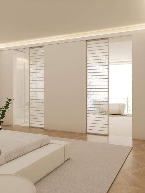 在玻璃的选择上,德立艺术玻璃比如油砂、水波纹、流砂金等,自带朦胧细腻质感,增强了空间的氛围感与艺术层次,也与云上舞白本身的朦胧诗意相得益彰,有效保护隐私的同时,为空间增添了层次感与高级感,营造宁静、舒缓的家居环境。