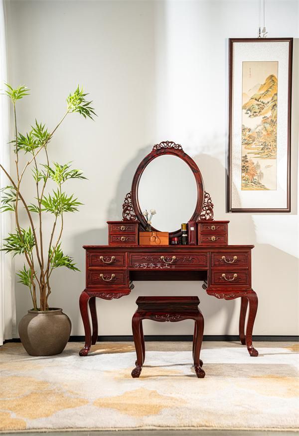 这款巧夺天工红木101梳妆台的设计,深谙东方女性的典雅之美。椭圆镜框线条流畅顺滑,映照出最动人的容颜。镜子两侧精雕细琢的卷草纹生机盎然,寓意青春永驻、美丽长存。