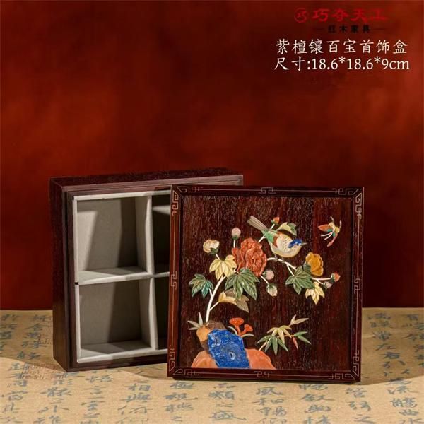素面首饰盒:以小叶紫檀为材,点缀精致铜件。三层格局,格子大小错落,分类齐全。返璞归真,适合喜欢极简、注重实用功能的气质女性。