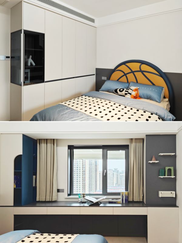 篮球造型床头搭配撞色设计,童趣感十足。窗边一体化书桌与收纳柜,让学习与收纳一步到位,为孩子打造专属的成长小天地。