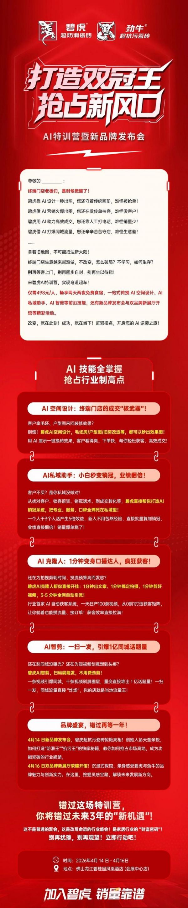 在此,我们向全国怀揣创业梦想的有志之士发出双重诚挚邀约:加入碧虎大家庭,共享新品牌红利,共拓防滑财富版图;更诚邀您莅临4月14-15日碧虎 AI 特训营暨新品牌发布会,深度解锁 AI 营销赋能密码,近距离感受新品牌核心魅力,与行业领军者共话市场新机遇!