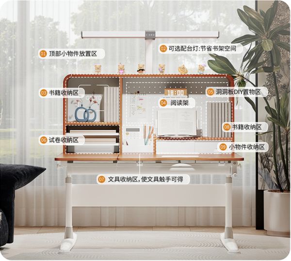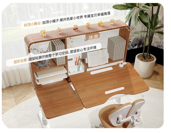 此次上市的 G7 120 学习桌,核心亮点聚焦柔弧设计与正姿功能。产品采用圆弧轮廓书架包裹式设计,搭配封顶小舞台造型,营造专注且有安全感的学习氛围;