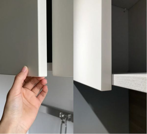 让柜门比柜体长出1-2厘米,利用延伸出来的部分作为拉手。不需要额外加装任何五金件,工艺简单,成本也低。用在吊柜、悬空柜这类位置再合适不过,轻轻一抠就能打开。