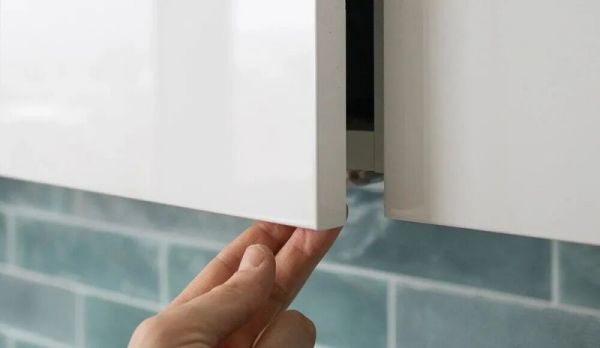 在门板上沿或下沿切出一个45度斜角,留出大约30毫米的夹缝作为施力点。不需要额外拉手,靠门板本身的斜切面完成开合。双饰面、烤漆板都可以做,但对工艺和板材要求较高。适合用在吊柜、地柜、岛台等位置。