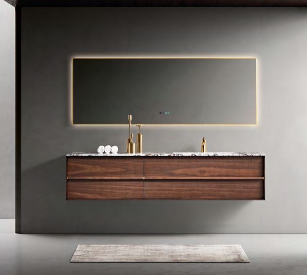 黑胡桃木的温润质感,搭配雪山银狐天然奢石台面,双盆设计搭配带金边的智能镜,把高级感直接拉满。悬浮式柜体 + 无封边工艺,2 米长的大尺寸完美适配大卫生间,暮秋时节的配色自带低调的贵气感。