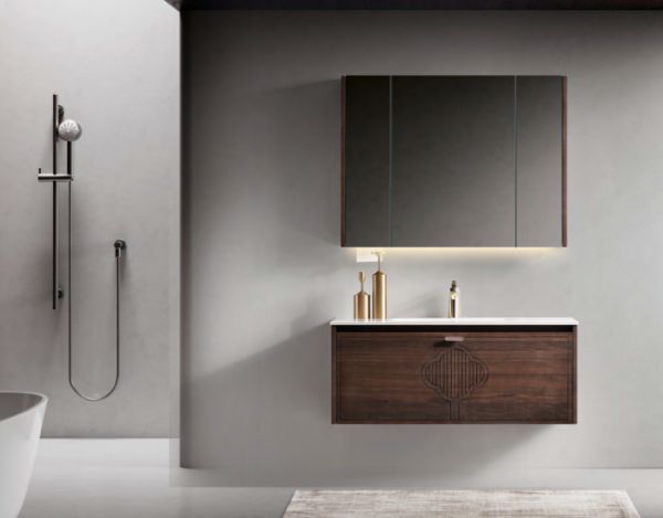 这款直接把宋式美学搬进卫生间!黑胡桃木柜体上的梅花纹雕花,搭配岩板卡拉拉白台面,细节里全是东方美学的留白感。镜柜自带美妆镜、除雾和手扫开关,实用又高级,小户型也能轻松 hold 住这份雅致。